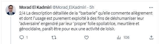 He continued: "The detailed description of the 'barbarism' which she blithely comments on and whose use is purely exploited for the purpose of dehumanizing their 'adversary' engendered by their 'own' despoliatory, murderous and genocidal madness, seems to be a leisure activity for them."