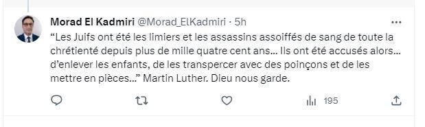 El Kadmiri's language—attributing collective guilt, invoking blood libel imagery, characterizing Jews as inherently deceptive and cruel—directly parallels the rhetoric used to justify historical harassment of Jewish communities. The academic credentials provide a veneer of respectability to ideas that would have been familiar to Wilhelm Marr or Karl Lueger.