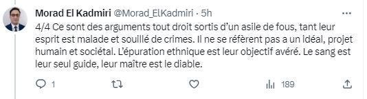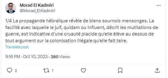 In his posts, he wrote: "Hebrew propaganda reveals very devious lies. The ease with which the Jew, whether ordinary or influential, describes the mutilations of war, is indicative of a placid cruelty that it elevates above any argument about illegal colonization that it silences."